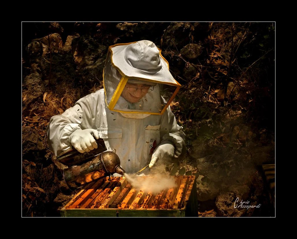 The photo of the beekeeper. I spent a whole day, in mid-August, in the sun with a beekeeper to be able to take this photo. Although I was wearing protective clothing the bees managed to sting me several times.