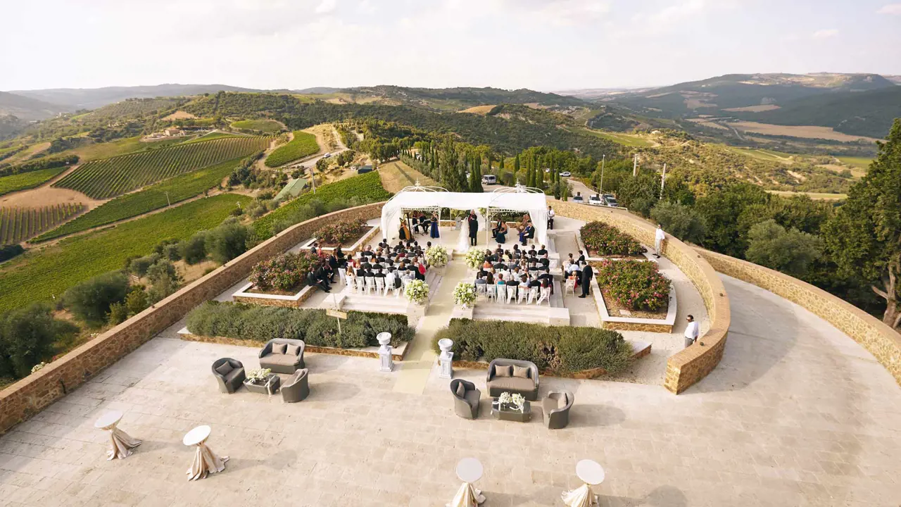 The venue offers several panoramic terraces, each oriented toward the cardinal points, providing a choice of backdrops ranging from the rolling hills of the Val d'Orcia to the densely planted vineyards of the estate. The North Terrace, positioned at the front of the castle, is the most iconic setting for ceremonies. It offers a dramatic stone background on one side and an endless horizon on the other, capable of seating up to 250 guests for civil or symbolic rituals.