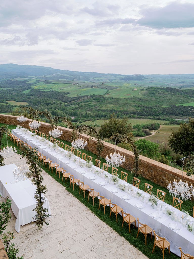 The wedding morning was spent in the castle’s opulent suites, where the bridal party prepared with views of the valley. The ceremony was held at the nearby Sant’Antimo Abbey, providing a Romanesque gravity to the vows. Following the ceremony, the couple arrived back at the castle in a vintage Spiaggina for a sunset cocktail hour on the panoramic terrace.